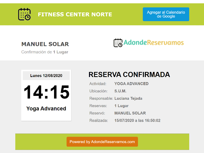 Ante cada nueva reserva, cancelación o modificación, la plataforma dispara un email a tu cliente y opcionalmente una copia a un usuario administrador.